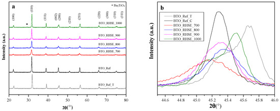 Figure 1a illustrates the crystalline structure of the BTOs as determined by XRD analysis. It is important to highlight that the XRD patterns for cubic and tetragonal BTO are almost identical; the only slight difference is the splitting of the (200) peak in the latter case, reflecting the slight structural distortion [18]. The XRD patterns of BTO_RHSE_700, BTO_RHSE_800, and BTO_RHSE_900 align well with the standard cubic barium titanate phase (JCPDS No. 31-174) [19]: distinct diffraction peaks were observed at 22.3°, 31.7°, 38.9°, 45.3°, 50.9°, 56.1°, and 65.8°, which correspond to the Miller indices (100), (110), (111), (200), (210), (211), and (220), respectively [20]. To investigate a possible cubic–tetragonal phase transition, we recorded the XRD patterns in the 44.5–46.0° region at the highest possible resolution (Figure 1b), which confirmed that these three samples are indeed cubic. In BTO_RHSE_1000, the (200) diffraction peak split to a doublet at 45.5° ((200) plane) with a shoulder at 45.2°, the latter of which can be attributed to the (002) crystallographic plane of tetragonal BTO [21,22,23]. For comparison, the XRD patterns of the commercial BTO samples with cubic (BTO_Ref_C) and tetragonal (BTO_Ref_T) structures were also recorded. In BTO_Ref_C, only a single diffraction peak at 45.3° is visible. However, in BTO_Ref_T, the splitting of the (200) diffraction peak could be observed as expected, confirming its tetragonal structure [22], the same way as in BTO_RHSE_1000. The small reflections observed at 2θ = 28.9° and 29.5° are unique to the RHSE samples and could be assigned to the (211) and (031) planes of barium orthotitanate (Ba2TiO4), respectively [21,24].