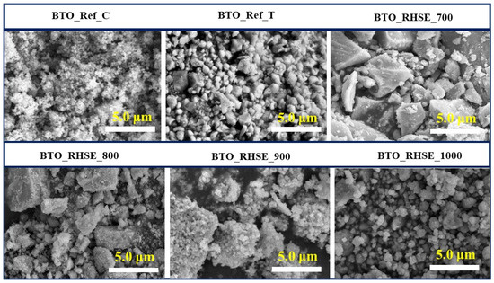 The morphology of samples can influence their photoactivity [26]; thus, SEM measurements were carried out and the results are shown in Figure 2. BTO_Ref_C is characterized by spherical particles with a low degree of aggregation. In contrast, BTO_RHSE_700 and BTO_RHSE_800 primarily consist of large, angular aggregates alongside smaller rounded particles. This trend reverses in BTO_RHSE_900 and BTO_RHSE_1000, where the large aggregates decrease, and smaller rounded particles become more prevalent, resembling the morphology observed for BTO_Ref_T.