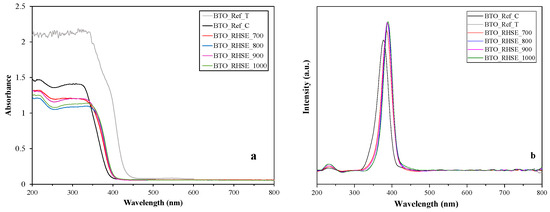 The absorbance (Figure 3a) and first-order derivative (Figure 3b) DR spectra of the samples were recorded to investigate the optical properties and calculate band gap values. The band gaps reported in the literature for BaTiO3 vary significantly, ranging between 3.0 and 3.6 eV [28,29]. The band gap values of our BTO_RHSE samples ranged from 3.18 to 3.21 eV (Table 1), which is close to the most frequently reported value (3.2 eV) [30]. A redshift could be observed as the band gaps expressed in wavelengths predominantly increased with increasing calcination temperature. This phenomenon has already been observed in our previous publications [14,31] and the literature [32] for TiO2. Since the difference in the band gap values of the samples is rather small, this will presumably not affect the photocatalytic activity significantly.