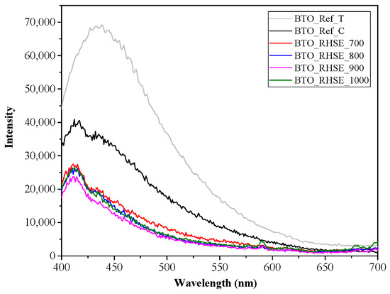 Figure 4 shows the PL spectra of the BTO catalysts recorded using an excitation wavelength of 350 nm. The higher PL intensity of the reference samples indicates a lower degree of recombination compared to the homemade samples. All the samples exhibit a broad emission peak centered around ~412 nm, with an additional shoulder at ~433 nm. This wide band, which shows the highest intensity, is attributed to the direct recombination of electrons and holes [33,34]. The asymmetric shape of the spectrum, which is characterized by the small decrease in intensity over an even wider region at the lower energy side, suggests the presence of defect sites within the lattice [35]. Notably, there is no clear correlation between the emission intensity of the samples and their calcination temperature.