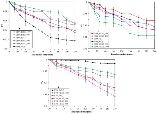 The photocatalytic performance of the BTO samples was evaluated through the degradation of three model pollutants: phenol (Figure 6a), chlorophenol (Figure 6b), and oxalic acid (Figure 6c). Before turning on the lamps, the photocatalysts were stirred in the dark to reach adsorption–desorption equilibrium. No adsorption was observed for phenol and chlorophenol, while the degree of adsorption was less than 3% for oxalic acid.