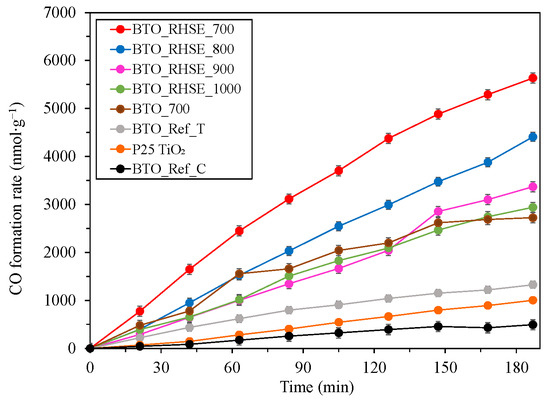 The photocatalytic activity of the samples was evaluated also by measuring the photocatalytic reduction of CO2 (Figure 7). As an additional reference, the well-known benchmark, P25 TiO2 was also considered. The selectivity for CO was consistently greater than 99.95% for all the samples. The conversion values are summarized in Table 1. Notably, BTO_Ref_C and BTO_Ref_T exhibited very low CO formation rates; lower than those of any of our BTO_RHSE samples. The same observation was made in the case of P25 TiO2. For our BTO_RHSE samples, significantly better CO2 conversion efficiencies were achieved: they increased consistently with the decreasing calcination temperatures used during the synthesis. This result is in good agreement with the specific surface areas that increased with decreasing calcination temperatures. A higher specific surface area provides more active sites for photocatalytic reactions, facilitating better interaction with the reactants, leading to increased CO formation [54]. The comparatively higher photoreduction activity of the samples compared to their photooxidation activity can be associated with their favorable conduction band minimum position [55,56,57] (Figure S3), enabling the following reaction: