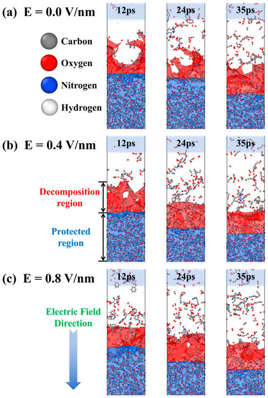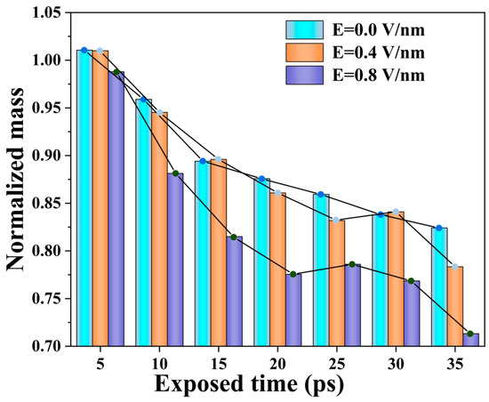 To quantitatively assess the extent of PI degradation during AO erosion under different electric field strengths, the normalized mass change of the model during AO erosion was calculated. The normalized mass is obtained by dividing the remaining mass of the model by its initial mass, as shown in Figure 2. In the first 15 ps, the normalized mass changes of PI models under no electric field and in a 0.4 V/nm electric field are nearly identical. As AO continues to inject energy into the model and reaches the PI decomposition threshold, the PI molecules begin to degrade extensively, leading to a significant decrease in mass. Under a 0.8 V/nm electric field, the polymer maintains a relatively fast degradation rate from the start of the simulation until the reaction ends. The strong electric field causes large-scale PI decomposition early in the simulation, and the degradation rate does not accelerate further with the introduction of AO. Instead, AO primarily collides with the degradation products. Between 25–35 ps at E = 0.4 V/nm and 20–25 ps at E = 0.8 V/nm, the normalized mass shows an increase, due to some decomposition products returning to the polymer surface after colliding with AO, offering some protection and slowing further degradation of the underlying polymer.