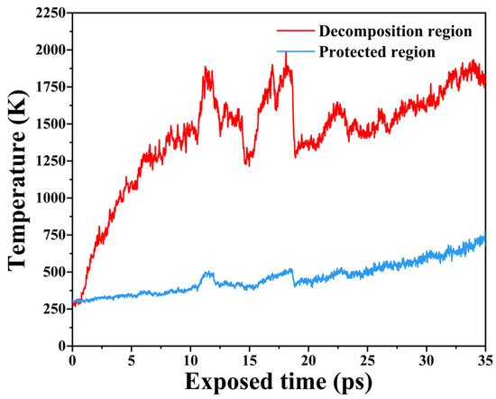 To explore the temperature evolution of the PI model during AO erosion, temperature changes in both the decomposition and protected regions were calculated, as shown in Figure 3. The temperature of the decomposition region continues to rise due to AO collisions and oxidation reactions with PI molecules, peaking at approximately 1800 K at 12.5 ps before decreasing. The surface PI molecules crack into small molecules, which escape and carry away heat, causing the temperature to drop to between 12 and 15 ps. At this point, the interface between the decomposition and protected regions descends, exposing PI molecules in the protected region to AO, continuing the reaction and causing the temperature to rise again. Free small molecules and PI molecules from the decomposition region provide protection for the underlying polymer. The temperature in the protected region rises more slowly, mainly due to heat exchange with the decomposition region.