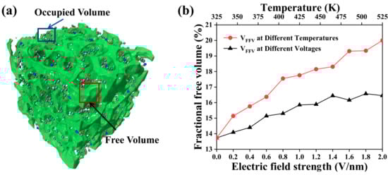 Free volume refers to the voids or non-densely packed regions within a polymer. These voids influence molecular chain movement, material diffusion properties, and the rate of AO penetration into the polymer structure [37,38]. To better analyze the void distribution in the amorphous region of PI under different voltages and temperature conditions, a spherical probe with a radius of 0.1 nm was used to move along the van der Waals surface to generate a Connolly surface. The volume between the probe atom and the van der Waals surface is considered free volume [39]. Figure 4 shows the changes in free volume under different electric field strengths and temperatures. Green areas represent free volume regions, while the remaining areas represent occupied atomic volume. The fractional free volume (FFV) is used to describe the relative changes in free volume under different conditions, as shown in Figure 4b. The expression for FFV is