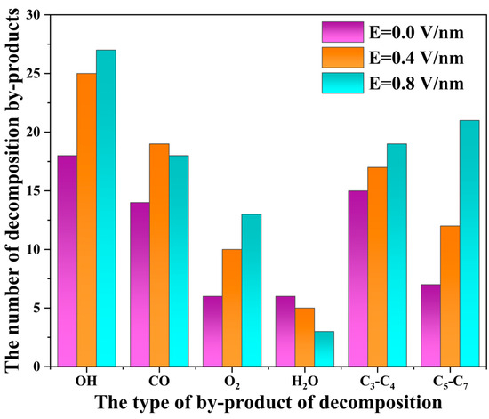 To analyze the products generated during AO erosion under different electric field strengths, the main products extracted after 35 ps of simulation were quantified, as shown in Figure 5. The primary products collected were OH, CO, O2, and H2O. Among all AO erosion processes, OH was the most abundant product, due in part to the high abundance of hydrogen atoms in PI, facilitating frequent hydrogen abstraction reactions by AO. The electric field also alters the electron distribution in PI molecules, changing the degradation pathways and making bond polarization and cleavage more likely, allowing AO to more easily extract hydrogen atoms from PI molecules. The charge redistribution of each atom in the ReaxFF force field under the electric field makes OH more susceptible to escaping from the polymer surface, reducing its subsequent reactivity. As a result, the amount of H2O produced decreases with increasing electric field strength. Additionally, the electric field redistributes the electron density in PI molecules, making oxygen atoms on the imide ring more likely to act as electron donors. The increased local electron density intensifies surface oxidation, leading to an increase in O2 production with stronger electric fields. Without an electric field or under weak fields, AO erosion primarily drives PI degradation, with AO preferentially attacking weak or easily oxidized bonds in PI chains, breaking them into shorter carbon chains (e.g., C3–C5). Under strong electric fields, direct forces on the bonds polarize and break them, forming longer carbon chains (e.g., C5–C7), with both AO erosion and PI degradation occurring simultaneously.
