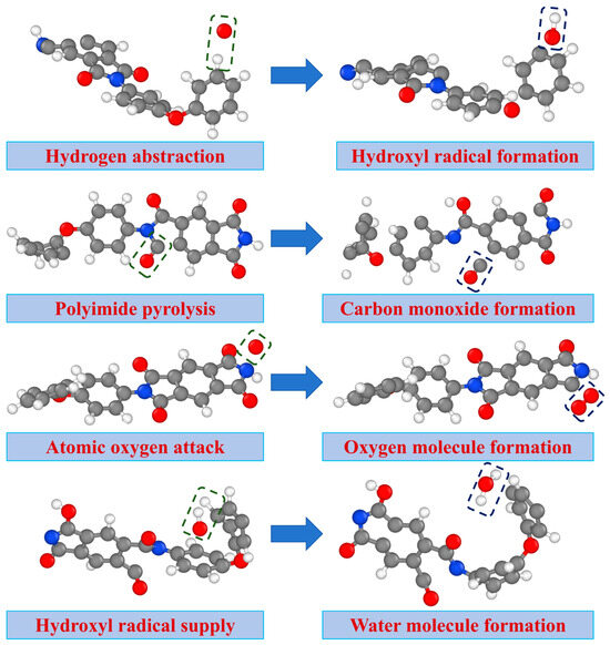 Figure 6 shows snapshots of the main products generated during the AO erosion reaction. AO’s unpaired electrons and high electronegativity make it prone to abstracting electrons from C-H bonds, forming hydroxyl radicals with hydrogen atoms. These radicals subsequently react with additional hydrogen atoms to produce water. As the erosion continues, the temperature of the polymer model rises, and when it reaches the thermal decomposition threshold of PI, C-N and C-C bonds in the imide ring break, generating CO. High temperatures provide enough energy to overcome bond energies in the imide ring, causing the molecular structure to collapse. AO oxidation reactions with the benzene ring generate OH and CO, which become the most abundant degradation products. The synergy between PI thermal decomposition and AO oxidation provides heat to drive the reaction, while intermediates from thermal decomposition offer additional reaction sites for AO. High temperatures and electric fields together activate the electronic distribution within PI molecules, lowering bond energy barriers and accelerating AO attacks on C=O bonds in the imide ring, inducing electron transfer and generating O2.