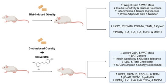 | [54] (2014) | Male Swiss Mice | RSV 4 g/kg 8 weeks | ↓ eWAT and rWAT → Lean mass, food intake, iBAT mass, and total mass Improved serum lipid profile (↓Total-C, and → HDL-C) ↓ Plasma glucose levels ↑ Oxygen consumption ↑ UCP1, SIRT-1, PTEN, and BMP-7 mRNA in BAT |