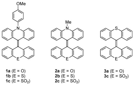 The preparation of acridine moiety-containing BAEs 1a, 1b, 1c, 2b, and 2c has been reported previously and involves the Pd-catalyzed annulation of phenazastannines with the corresponding 1,1-dibromoalkenes [45]. Using the same protocol, 2a and 3a were synthesized in 56% and 52% yields from 9-(dibromomethylene)xanthene (4) [48] and 10,10-dimethyl-5-methylphenazastannine (5) [49] or 10,10-dimethyl-10H-phenothiastannin (6) [49], respectively (Scheme 1). The annulation of 9-(dibromomethylene)-9H-thioxanthene-10,10-dioxide (7) [45] with 6 afforded 3c in a 56% yield. The decomposition temperatures (Td) of 1–3, at which 5% of the mass was lost, were 291 (1a), 304 (1b), 322 (1c), 278 (2a), 282 (2b), 309 (2c), 256 (3a), and 303 °C (3c), indicating that the BAEs were thermally very stable.