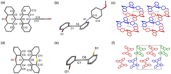 Single crystals of 1a and 3a suitable for X-ray diffraction analysis were obtained by recrystallization from a solution of ethyl acetate and dichloromethane, respectively. CCDC numbers of 1a and 3a are CCDC 2180600 and 2180603. Compound 1a crystallized in the triclinic space group P-1. As shown in Figure 3a,b, the tetraarylated ethene moiety (C2(C4)C1=C6(C7)C9) was flat, having dihedral angles of 0.10° (∠C2–C1–C6–C7) and 1.16° (∠C4–C1–C6–C9). The length of the C1=C6 bond is 1.358 Å, slightly longer than a standard value of the C=C bond (1.34 Å) [50], and the ∠C2–C1–C6, ∠C4–C1–C6, ∠C2–C1–C4, ∠C1–C6–C7, ∠C1–C6–C9, and ∠C7–C6–C9 bond angles are 124.92°, 125.72°, 109.36°, 124.11°, 125.12°, and 110.75°, respectively, which are significantly deviated from the ideal sp2 carbon angle of 120°. The unusual bond angles probably reduced the steric crowding around the tetraarylated ethene moiety. The central six-membered rings of the acridine and xanthene moieties adopted a boat-like conformation. The methoxyphenyl group was almost perpendicular to the acridine moiety, having a dihedral angle of 79.06° (∠C11–N1–C13–C14), suggesting that the N-aryl group did not participate in the conjugated system of the acridine moiety. Probably due to the bent molecular framework, there is no close packing between the BAE cores (Figure 3c), which is an attractive characteristic for the realization of efficient solid-state emissions. Compound 3a crystallized in the orthorhombic space group Pca21. As observed for 1a, the tetraarylated ethene moiety (C2(C4)C1=C6(C7)C9) of 3a was also flat, having dihedral angles of 3.16° (∠C2–C1–C6–C7) and 0.05° (∠C4–C1–C6–C9), and the bond angles at the sp2 carbons differed significantly from 120° (125.37° for ∠C2–C1–C6, 124.72° for ∠C4–C1–C6, 109.88° for ∠C2–C1–C4, 124.05° for ∠C1–C6–C7, 123.58° for ∠C1–C6–C9, and 112.36° for ∠C7–C6–C9) (Figure 3d). The conformations of the pyran and thiopyran rings were characterized as boat conformations (Figure 3e). Each molecule in the crystal forms a loose packing structure, which is advantageous for avoiding concentration quenching in the solid state (Figure 3f).