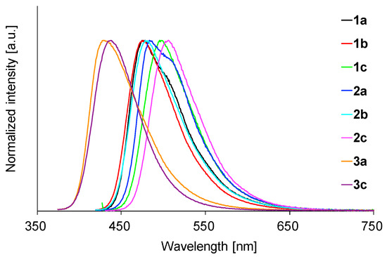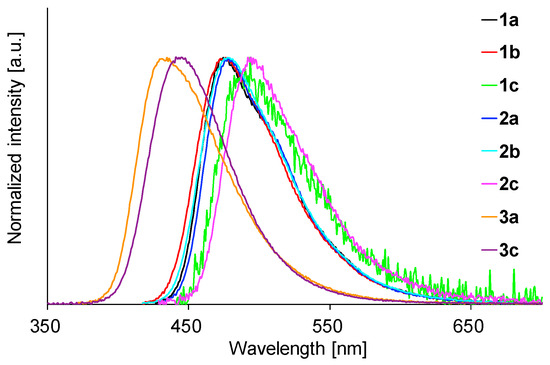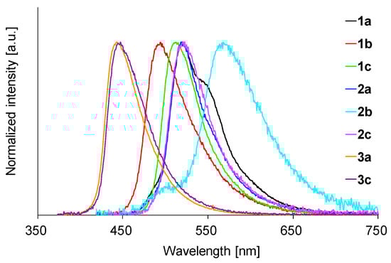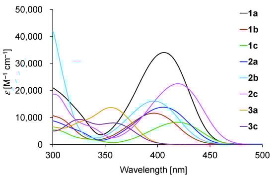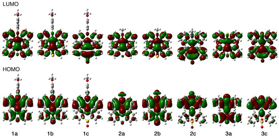 The absorption data and spectra of 1–3 in toluene are shown in Table 1 and Figure 4, respectively. The absorption maxima of 1a, 1b, and 1c are almost the same as those of 2a, 2b, and 2c, respectively, indicating that the nitrogen substituent does not influence the energy gaps between the highest occupied molecular orbitals (HOMOs) and lowest unoccupied molecular orbitals (LUMOs). The maxima of 1a–1c and 2a–2c were red-shifted in the order 1b, 1a, 1c, 2b, 2a, and 2c. The maxima of 3a and 3c were significantly blue-shifted compared to those of 1 and 2, which is reasonable considering that the electron-donating nature of a sulfur atom is less than that of a nitrogen atom.