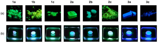 In sharp contrast to the weak fluorescence in toluene, brilliant green fluorescence (λem = 494–568 nm) was observed for the solid samples of 1 and 2. In contrast, 3a and 3c efficiently emitted blue fluorescence at 443 and 448 nm, respectively, in microcrystalline solid form (Figure 6a). The fluorescence data and spectra are summarized in Table 2 and shown in Figure 7. The fluorescence quantum yields were good to excellent (Φ = 0.45–0.88) and were higher than those in toluene, except for that of 2b (Φ = 0.30). Until now, only 0.308 and 0.347 have been reported as solid-state quantum yields of BAEs for 9-(9H-xanthen-9-ylidene)-9H-xanthene [23] and tetrabenzo[5.7]fulvalene [24]. Thus, these results demonstrate that the developed BAEs are a novel class of organic fluorophores that exhibit efficient fluorescence in the solid state [51,52,53,54,55,56,57]. The fluorescence maximum and quantum yield of 2b were 568 nm and 0.30, respectively. Compared to other BAEs, the maximum was significantly red-shifted, and the yield was much lower, suggesting that 2b was densely aggregated in the solid state, and thus, suffered from severe concentration quenching.