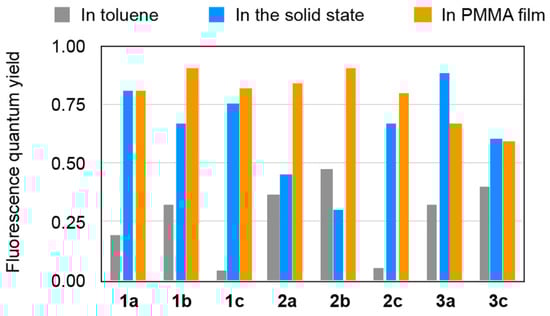Fluorescence data of 1–3 in toluene, in the solid state, and in PMMA film.