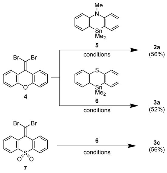 - Shimizu, M.; Nishimura, K.; Mineyama, M.; Fuji, H. Palladium-Catalyzed Annulation of Phenazastannines with 9-(Dibromomethylene)fluorene and -(thio)xanthenes: Facile Synthesis of Acridine Moiety-Containing Bis(tricyclic) Aromatic Enes. Org. Process Res. Dev. 2019, 23, 1740–1745. [Google Scholar] [CrossRef]