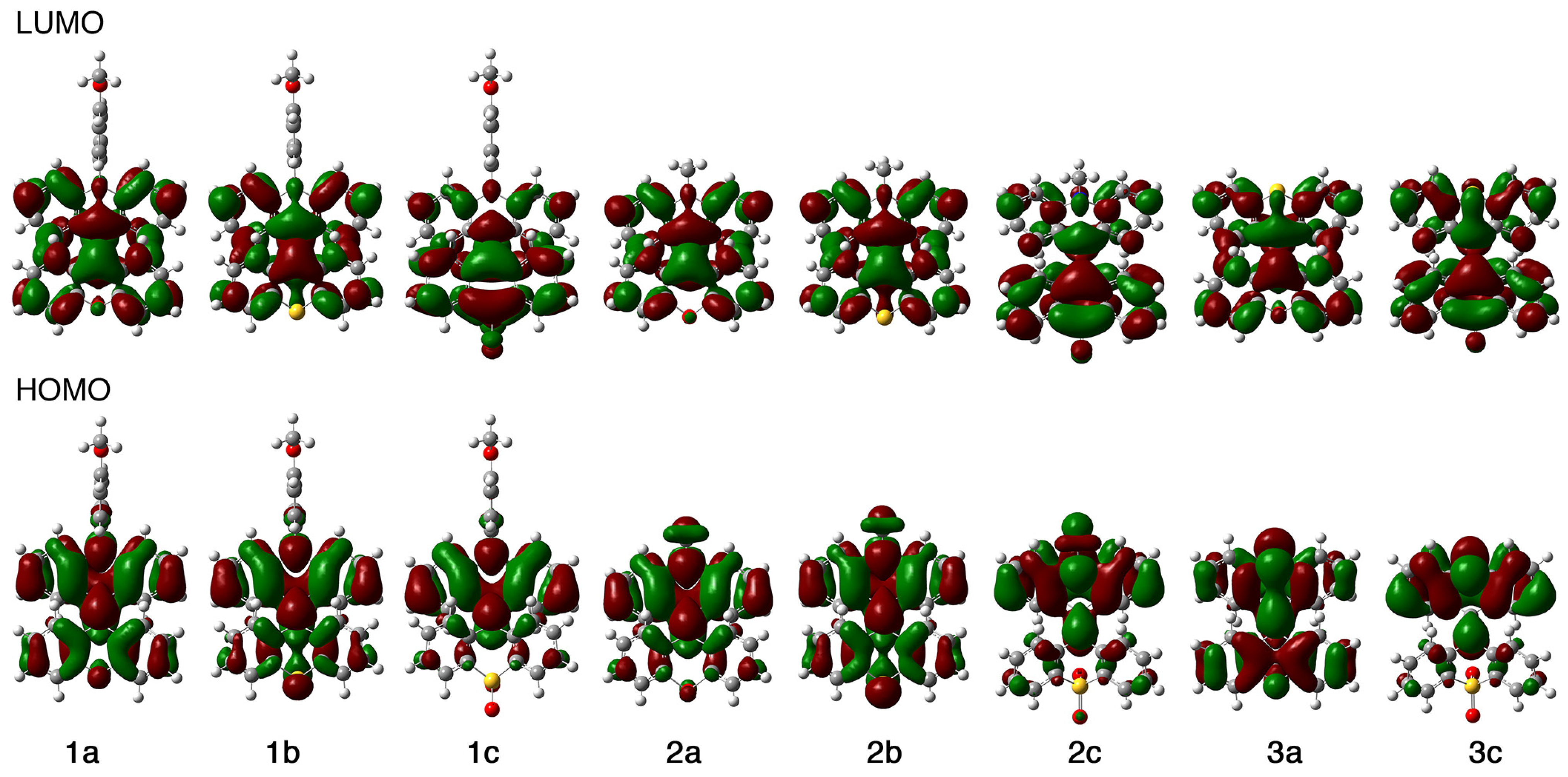 Toluene solutions of 1–3 were faintly or moderately fluorescent (Table 2). The spectra are shown in Figure 5. The emission maxima of 1a–1c and 2a–2c appeared at 475–494 nm, whereas 3a and 3c fluoresced at 435 and 441 nm. The shorter wavelengths of the emission maxima of 3a and 3c compared to those of 1a–1c and 2a–2c are consistent with the trend in the absorption maxima. In contrast, the fluorescence maxima of 1a and 2a were almost the same as those of 1b and 2b, respectively, which is inconsistent with the absorption data. These results suggest that the electronic structures of the lowest singlet excited states (S1 states) of isolated 1a and 1b as well as 2a and 2b are quite similar (see Theoretical Calculations). Except for those of 1c and 2c (0.04 and 0.06, respectively), the quantum yields of 1–3 in toluene were moderate. Since the radiative decay constants (kr) of 1c and 2c were comparable to those of the others, the primary cause of the very low quantum yields of an SO2 moiety-containing 1c and 2c in toluene is the large nonradiative decay constants (knr) of 32.0 and 23.5, respectively, which are an order of magnitude larger than those of the others (see Table S1 in Supplementary Material).