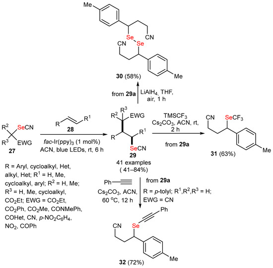 The alkylselenocyanate-based bifunctional reagents 27 have been synthesized and used as new reagents for the simultaneous transfer of an alkyl group in addition to –SeCN to olefins under photocatalytic conditions [42]. In this approach, mixtures of alkylselenocyanates 27 and olefins 28 were subjected to reaction in the presence of fac-Ir(ppy)3 as a catalyst, under irradiation with blue LEDs in ACN solvent, generating the corresponding functionalized selenocyanated products 29 in acceptable-to-good yields (Scheme 5). To demonstrate the application of the selenocyanated compounds 29, the SeCN group of the representative derivative 29a was converted to the diselenide derivative 30a in 58% yield by reductive treatment with LiAlH4 in THF. The CN functionality of 29a was transformed into the CF3Se-product 31a in 63% yield by treatment with TMSCF3 in the presence of Cs2CO3. Additionally, the nucleophilic substitution of the CN group afforded the alkynylselenate 32a in 72% yield by reacting derivative 29a with phenylacetylene in the presence of Cs2CO3.