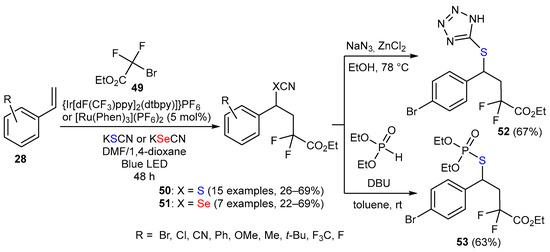 Recent investigations have revealed an efficient thio(seleno)cyano-difluoroalkylation reaction involving three-component systems that utilize alkenes 28 and ethyl bromodifluoroacetate 49 in a solvent mixture of N,N-dimethylformamide and 1,4-dioxane. This reaction was carried out under blue LED irradiation using iridium (or ruthenium) complexes as photocatalysts and resulted in the formation of the cyano derivatives 50 and 51 with yields ranging from 26 to 69% and from 22 to 69%, respectively, as shown in Scheme 11. Subsequently, the SCN functionality was converted to thiotetrazole 52 in 67% yield by treating 50 (R = Br) with NaN3 and ZnCl2. In addition, the phosphate analog 53 was prepared in 63% yield by reacting 50 (R = Br) with diethyl phosphonate in the presence of DBU [48].