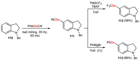 In another study, a mechanochemical method was developed in order to synthesize (hetero)aryl selenocyanates from arenes and heteroarenes using the electrophilic selenocyanating reagent PhthSeCN. This protocol enabled the production of the selenocyanate 111 in 76% yield under ball milling, as shown in Scheme 20. The synthetic utility of the method was demonstrated by the facile synthesis of organoselenium derivatives. For example, the trifluoromethylselenylated indoline 112 was obtained in 58% yield by treating selenocyanate 111 with (trifluoromethyl)trimethylsilane (TMSCF3) in the presence of tetrabutylammonium fluoride (TBAF) in THF. Furthermore, selenocyanate 111 was converted to diarylselenide 113 in 96% yield by using PhMgBr as a Grignard reagent, as shown in Scheme 20 [67].