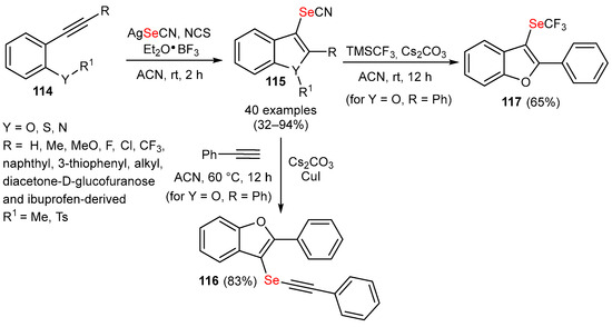 - Wang, J.; Lu, X.; Tan, X.; Yan, Y.; Zhang, P.; Chao, S.; Liu, L.; Shang, X.; Chu, Z. Electrophilic selenocyanogen cyclization of alkynes; synthesis of benzofurylselenocyanates, benzothienylselenocyanates and indolylselenocyanates. Adv. Synth. Catal. 2022, 364, 2235–2240. [Google Scholar] [CrossRef]