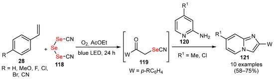 - Guo, T.; Wei, X.N.; Liu, Y.; Zhang, P.K.; Zhao, Y.H. Oxidative dual C–H selenation of imidazoheterocycles with ethers or alkanes using selenium powder via a radical pathway. Org. Chem. Front. 2019, 6, 1414–1422. [Google Scholar] [CrossRef]