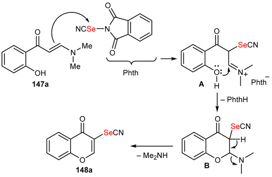 - Xiao, J.-A.; Cheng, X.-L.; Meng, R.-F.; Qin, X.-S.; Peng, H.; Ren, J.-W.; Xie, Z.-Z.; Cui, J.-G.; Huang, Y.-M. Straightforward synthesis of 3-selenocyanato-substituted chromones through electrophilic selenocyanation of enaminones under grinding conditions. Synthesis 2021, 53, 954–960. [Google Scholar] [CrossRef]