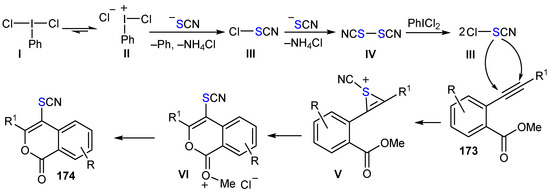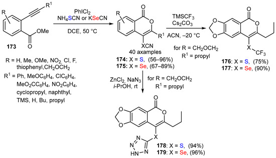- Tao, S.; Huo, A.; Gao, Y.; Zhang, X.; Yang, J.; Du, Y. PhICl2-mediated regioselective and electrophilic oxythio/selenocyanation of o-(1-alkynyl)benzoates: Access to biologically active S/SeCN-containing isocoumarins. Front. Chem. 2022, 10, 859995. [Google Scholar] [CrossRef]