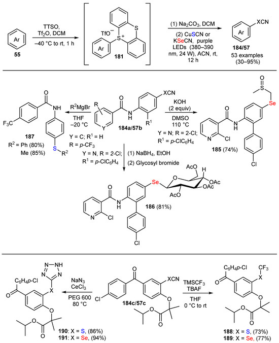 A large number of research papers on thio-/selenocyanated compounds have appeared in the past two decades along with several reviews [1,2,3,4,5,6,7,8,9,10,11]. Encouraged by their diverse chemical properties, we have focused the present article on the relevant literature published from 2011 to the present, focusing primarily on the new and improved methods for the direct synthesis of organic thio- and selenocyanated (SCN and SeCN) compounds and their elaboration into more complex structures, while also addressing their biological activity.