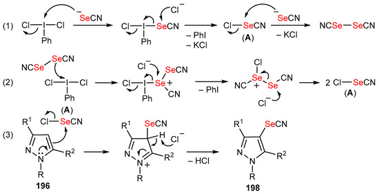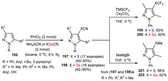 - Wu, J.; Shi, H.; Li, X.; He, J.; Zhang, C.; Sun, F.; Du, Y. Synthesis of 4-functionalized pyrazoles via oxidative thio- or selenocyanation mediated by PhICl2 and NH4SCN/KSeCN. Beilstein J. Org. Chem. 2024, 20, 1453–1461. [Google Scholar] [CrossRef]