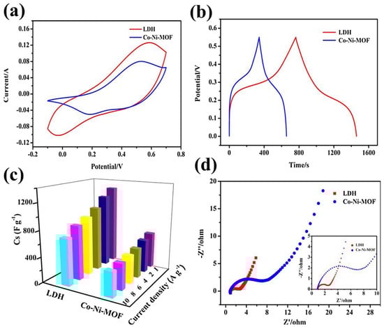 (a) CVs, (b) GCDs, (c) specific capacitance, and (d) EIS curves of Co-Ni-MOF and LDH. Reproduced with permission [62].
