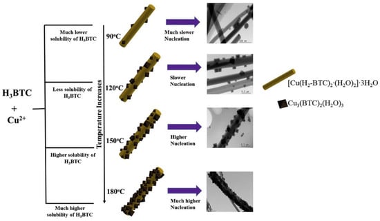 The SEM results demonstrated that the obtained Cu-MOF consists of an oriented nanowire-like structure. The obtained results demonstrated a decent specific capacitance of 41.1 mF/cm2 at 0.5 A/g. This work expands the synthesis approach from traditional liquid- or gas-phase reactions to a solid–solid reactions, which is anticipated to enable the fabrication of a wide range of conductive MOFs in supercapacitor applications. Liu et al. [64] synthesized Cu-based layered coordination polymer ([Cu(hmt)(tfbdc)(H2O)] (where hmt = hexamethylenetetramine, and tfbdc = 2,3,5,6-tetrafluoroterephthalate; Cu-LCP) using a solvothermal method. The Cu-LCP showed higher specific capacitance of 1274 F/g at 1 A/g in a 1 M lithium hydroxide (LiOH)-based system. The Cu-LCP also retained about 88% specific capacitance after 2000 cycles. This may be ascribed to the structural surface properties of the prepared Cu-MOF. The SEM results showed that Cu-MOF comprised of a nanorods-like surface, which may provide better electro transportation. It was believed that the relatively small diameter of the synthesized Cu-LCP nanorods may reduce the ion diffusion length and increase the number of active sites available for electrochemical reactions. Liu et al. [65] proposed the preparation of a conjugated copper catecholate linker (dibenzo-[g,p]chrysene-2,3,6,7,10,11,14,15-octaol (8OH-DBC)=Cu-DBC)-based Cu-MOF using a D2-symmetric redox-active ligand in a copper bis(dihydroxy) coordination geometry. The prepared Cu-DBC has decent conductive nature and can be used as an electrocatalyst for energy storage applications. The Cu-DBC was further used as an electrode material, and the obtained results demonstrated a specific capacitance of 479 F/g at 0.2 A/g. The authors also reported an acceptable retention-specific capacitance of 80% after 2000 cycles. Hou et al. [66] proposed the fabrication of intrinsically conductive Cu-MOF nanowire arrays on the self-supported poly-pyrrole membrane for the development of binder-free flexible supercapacitors. The Cu-MOF nanowire arrays may afford decent conductivity with enough active surface area for the accessibility of the liquid electrolyte, while the poly-pyrrole membrane may provide acceptable mechanical flexibility, extra capacitance, and improved charge transfer skeleton. The authors achieved the specific capacitance of 252.1 mF/cm2. This research work not only introduces a durable and flexible electrode for supercapacitors which can operate across a wide temperature range but also provides important insights for designing Cu-MOF-based hybrid materials for the construction of supercapacitors. The development of new MOFs are the most promising and important task to further enhance the performance of the supercapacitor electrodes. Ma et al. [67] proposed new Cu-based MOF materials for energy storage applications. The synthesized Cu-MOF (Cu-atrz-BDC) has decent specific surface area of 13.96 m2/g and average pore size of 14.6 nm. The Cu-atrz-BDC electrode demonstrated a high specific capacitance of 5525 F/g at 1 A/g. The proposed electrode materials exhibited decent mechanical stability and cyclic stability. Ramachandran et al. [68] reported the synthesis of copper benzene@1, 3, 5-tricarboxylate (Cu@BTC) using a hydrothermal method. The authors found that synthesized Cu@BTC comprises two mixed phases (Cu3(BTC)2·3H2O + {[Cu(BTC-H2)2·(H2O2)]·3H2O}). The authors also proposed the mechanism for the formation of two phases in the prepared Cu@BTC sample as shown in Figure 3.
