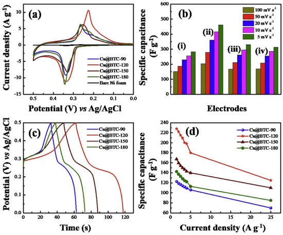 (a) CV responses and (b) specific capacitance of five different electrodes (i–iv) at different applied scan rates (5–100 mV/s). (c) GCD curves at 2 A/g and (d) specific capacitance versus current density of different electrodes. Reproduced with permission [68].