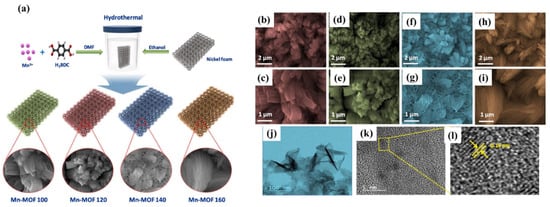 (a) Schematic graph for the synthesis of Mn-MOF. SEM images of Mn-MOF synthesized under different temperature conditions: (b,c) Mn-MOF 100, (d,e) Mn-MOF 120, (f,g) Mn-MOF 140, and (h,i) Mn-MOF 160. TEM image (j) and HRTEM images (k,l) of Mn-MOF 140. Reproduced with permission [81].