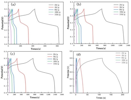 GCD graphs of the (a) Ni-MOF (0 mL), (b) Ni-MOF (0.5 mL), (c) Ni-MOF (1 mL), and (d) Ni-MOF (1.5 mL). Reproduced with permission [84].
