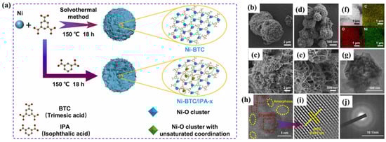 (a) Schematic diagram shows the synthesis of Ni-MOF. (b) SEM pictures of (b,c) Ni-BTC and (d,e) Ni-BTC/IPA-3. (f) EDX mapping for C, O and Ni elements, (g) TEM, (h) HRTEM image, (i) crystal faces intensity profile, and (j) SAED patterns for Ni-BTC/IPA-3. Reproduced with permission [86].