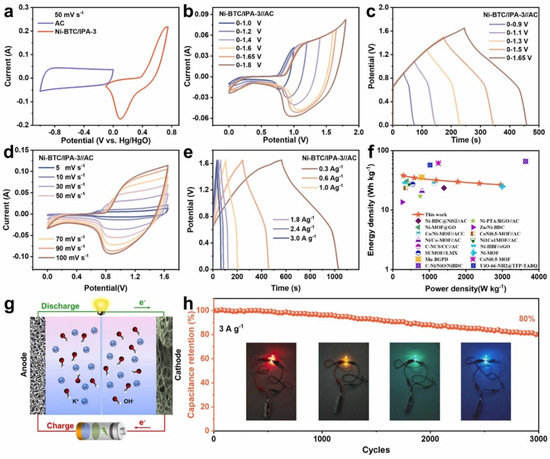 (a) CV curves of Ni-BTC/IPA-3 and AC electrode at 50 mV/s. (b) CVs at 50 mV/s. (c) GCD results at 0.6 A/g at different potential windows, (d) CV curves, (e) GCD graphs, (f) Ragone plots, (g) schematic structure of working principle, and (h) cyclic performance at 3 A/g. Reproduced with permission [86].
