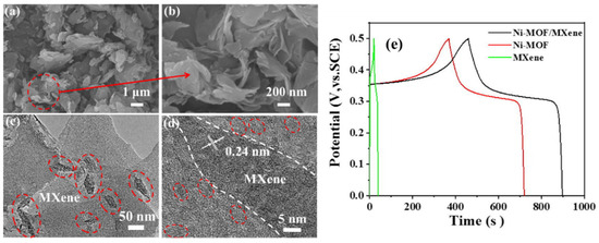 (a,b) SEM, (c) TEM, and (d) HRTEM image of Ni-MOF/MXene (red circle shows presence of NiO). (e) GCD curve of MXene, Ni-MOF, and Ni-MOF/MXene. Reproduced with permission [94].