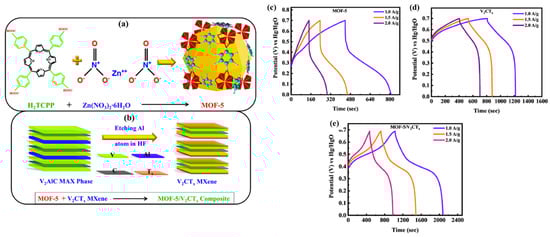 Hassan et al. [95] prepared a novel MOF-5 using a simple hydrothermal approach (Figure 11a), where V2CTx MXene was subjected to standard HF etching, followed by the synthesis of a MOF-5/V2CTx composite in a one-step hydrothermal process. The MOF-5 and V2CTx, used as template or precursor sources, have some limitations, such as inconsistent pore size distribution in the carbonized product, durability issues, poor performance, and challenges in cost-effective synthesis. Therefore, authors used V2CTx MXene along with affordable conductive linkers for synthesizing MOF-5/V2CTx composites, which may offer an alternative approach to the preparation of versatile electrode materials. The synthesized MOF-5/V2CTx composite exhibited high porosity, numerous active sites, and uniform dispersion of the MOF-5 porous structure on the V2CTx MXene, which makes it a promising electrode materials for energy storage applications.