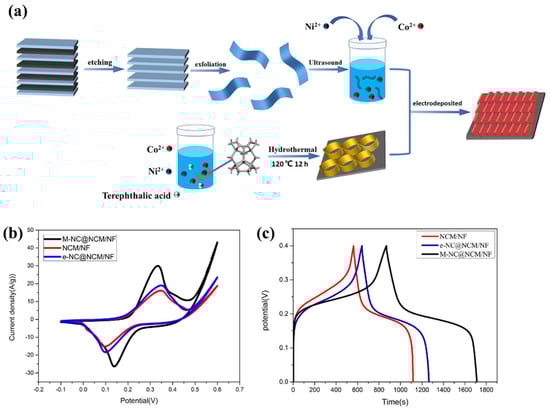 (a) Schematic graph shows the synthesis of M-NC@NCM/NF electrode. (b) CV and (c) GCD curves of the different electrodes. Reproduced with permission [98].