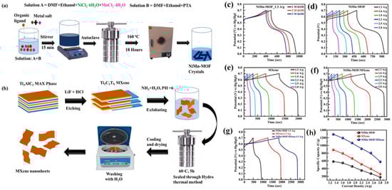 Schematic picture shows the synthesis of (a) NiMn-MOF and (b) hydrothermal preparation of MXene. GCD curves of Ni-Mn-MOF in different concentrations of KOH (c) and at (d) different current densities. GCD graphs of the (e) MXene, and (f) NiMn-MOF/MXene at different current density. GCD curves of the (g) NiMn-MOF, MXene, and NiMn-MOF/MXene. (h) Specific capacity of NiMn-MOF, MXene, and NiMn-MOF/MXene. Reproduced with permission [101].