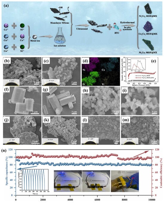 The synthesis of NiMn-MOF and hydrothermal treatment for MXene are shown in Figure 13a and Figure 13b, respectively. The GCD graphs of the NiMn-MOF exhibited the high specific capacitance in a 1 M KOH electrolyte compared to the 2 M or 3 M KOH system as shown in Figure 13c. The GCD graphs of the NiMn-MOF at different applied current densities are summarized in Figure 13d. It can be observed that NiMn-MOF has high electrochemical performance at a current density of 1.3 A/g. The MXene-based electrode also exhibited improved specific capacitance compared to the NiMn-MOF at current density of 1.3 A/g (Figure 13e). Further, enhancement in the specific capacitance was also observed for the prepared NiMn-MOF/MXene composite compared to the pristine NiMn-MOF or MXene (Figure 13f–h). The proposed NiMn-MOF/MXene electrode material showed specific capacitance of 215.5 C/g with retention capacity of 90% after 5000 cycles. Ji et al. [102] investigated the synthesis of a range of bimetallic MxNy-MOF materials (such as Ni1Co1-MOF, Ni1Co3-MOF, Ni3Co1-MOF, Cu1Co1-MOF, and Ni1Cu1-MOF) and their composites with MXenes. The synthesis of the electrode materials are summarized in Figure 14a. The surface morphology of the synthesized Ni1Co1-MOF and (c) Ni1Co1-MOF@MXene. (d) EDX and (e) BET-BJH curves of Ni1Co1-MOF@MXene. SEM image of (f) Ni1Co3-MOF, (j) Ni1Co3-MOF@MXene, (g) Ni3Co1-MOF, (k) Ni3Co1-MOF@MXene, (h) Cu1Co1-MOF, (l) Cu1Co1-MOF@MXene, (i) Ni1Cu1-MOF, and (m) Ni1Cu1-MOF@MXene were checked by employing SEM. The obtained SEM, EDX, and BET results are displayed in Figure 14b–m. The Ni1Cu1-MOF/MXenes demonstrated a high specific capacitance of 1493.6 F/g at current density of 1 A/g with 52.7 retention after 5000 cycles (Figure 14n). Wei et al. [103] used hard template method for the preparation of MXene@NiCo-MOF and used it as an electrode material, which demonstrated a high specific capacitance of 2078.1 F/g at current density of 1 A/g.