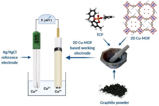 Zhao et al. [113] reported a novel 2D conductive MOF-based material using 2, 3, 7, 8, 12, 13-hexahydroxyl truxene and copper ions as starting materials. The synthesized c-MOF was further used for electrochemical sensing of paraquat and demonstrated a good limit of detection of 4.1 × 10−8 M and linear range of 0.2 to 5 µM. Elashery et al. [114] synthesized 2D Cu-MOF using simple strategies and characterized by sophisticated techniques. The synthetic process for the preparation of 2D Cu-MOF and electrode preparation has been illustrated in Figure 15. The synthesized Cu-MOF was further adopted as electrode material for the sensing of Cu (II) ions and reported decent LOD of 1 × 10−8 M.