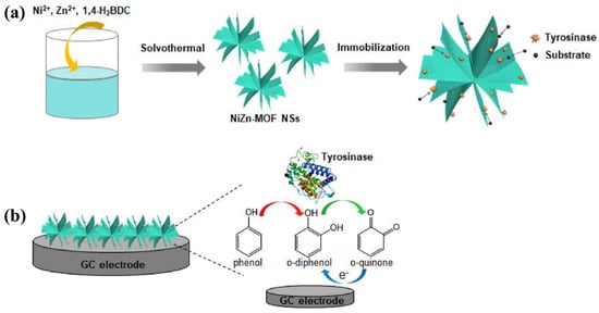 Wen et al. [115] reported the synthesis of 2D bimetallic Ni- and Zn-based MOF nanosheets (NiZn–MOF NSs) with adjustable Ni/Zn ratios which were further utilized as electrode materials for the development of a tyrosinase biosensor (Figure 16a). The synthesized NiZn–MOF was characterized by employing XRD and SEM methods. The XRD pattern exhibited the presence of a decent crystalline nature in the prepared NiZn–MOF whereas SEM results demonstrated that SEM investigations showed that prepared material has flower-like cluster structure. The electrochemical sensing ability of the proposed electrode material was checked by using CV and amperometry methods. The fabricated sensor demonstrated excellent selectivity, long term stability, and high recovery in real samples. The working mechanism for the sensing of tyrosinase has been described in Figure 16b.