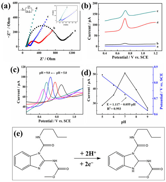 (a) EIS of different electrodes (GCE (a), ZIF-L/GCE (b), ERGO/GCE (c), and ERGO@ZIF-L/GCE (d)) in 5 mM K3Fe(CN)6/K4Fe(CN)6) system in 0.1 M KCl. (b) DPV curves of the different electrodes (GCE (a), ZIF-L/GCE (b), ERGO/GCE (c), and ERGO@ZIF-L/GCE (d)) in 10 µM benomyl. (c) DPV curves of the ERGO@ZIF-L/GCE in presence of 10 µM benomyl at different pH values. (d) Effects of pH values against current and potential peaks. (e) Working mechanism for the sensing of benomyl. Reproduced with permission [117].