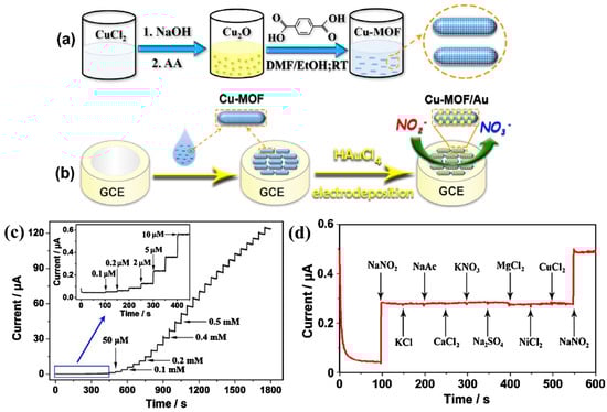 (a) Synthetic illustration for Cu-MOF. (b) Cu-MOF-based electrode modification illustration. (c) Amperometry results for the sensing of nitrite. (d) Selectivity results. Reproduced with permission [119].