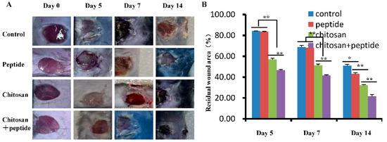 SIKVAV-modified chitosan hydrogels enhanced the contraction of skin wounds in diabetic mice. (A) Representative photographs of typical wounds among the control group, peptide group, chitosan group, and SIKVAV-modified chitosan group at 5, 7, and 14 days post-surgery; (B) statistical evaluation of the residual wound percentages in diabetic mice across the control group, peptide group, chitosan group, and SIKVAV-modified chitosan group (n = 3, * for p < 0.05, and ** for p < 0.01).