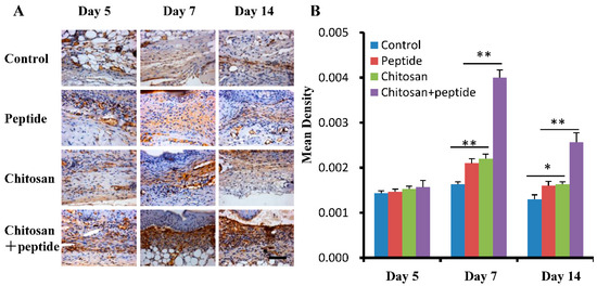 SIKVAV-modified chitosan hydrogels expedited the expression of α-SMA in the skin wounds of diabetic mice. (A) Immunohistochemistry illustrating the expression of α-SMA in the skin wounds across the control group, peptide group, chitosan group, and peptide-modified chitosan group at 5, 7, and 14 days post-surgery (scale bar: 50 μm); (B) statistical evaluation of α-SMA in the skin wounds among the control group, peptide group, chitosan group, and peptide-modified chitosan group at 5, 7, and 14 days following surgery (n = 3, * for p < 0.05, and ** for p < 0.01).