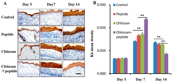 SIKVAV-modified chitosan hydrogels enhanced the proliferation of keratinocytes in the skin wounds of diabetic mice. (A) The levels of K6 expression in keratinocytes were evaluated in the control group, peptide group, chitosan group, and peptide-modified chitosan group using immunohistochemical techniques at 5, 7, and 14 days following surgery (scale bar: 50 μm). (B) The optical density of keratinocyte K6 was statistically assessed in the control group, the peptide group, the chitosan hydrogels group, and the peptide-modified chitosan hydrogels group at 5, 7, and 14 days post-surgery (n = 3, ** for p < 0.01).