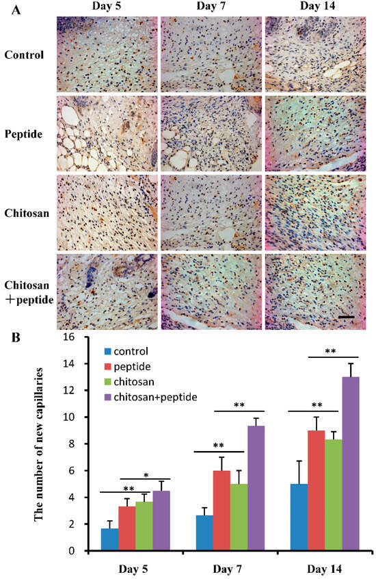 SIKVAV-modified chitosan hydrogels enhanced angiogenesis in the skin wounds of diabetic mice. (A) Immunohistochemical evaluation of CD31 expression in vascular endothelial cells of the skin wounds at 5, 7, and 14 days post-surgery among the control group, the peptide group, the chitosan group, and the SIKVAV-modified chitosan group (scale bar: 50 μm); (B) statistical assessment of new blood capillaries among the control group, peptide group, chitosan group, and SIKVAV-modified chitosan group (n = 3, * for p < 0.05, and ** for p < 0.01).