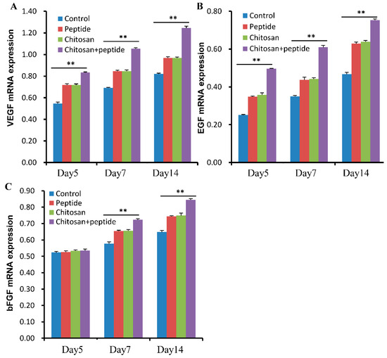 SIKVAV-modified chitosan hydrogels significantly increased the mRNA expression levels of growth factors in the skin wounds of diabetic mice at 5, 7, and 14 days post-treatment. This enhancement includes the mRNA levels of (A) VEGF, (B) bFGF, and (C) EGF (n = 3, ** for p < 0.01).