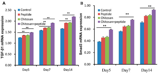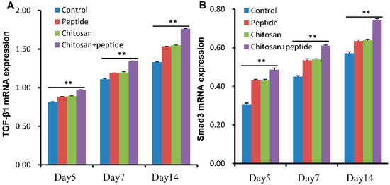 SIKVAV-modified chitosan hydrogels increased the expression levels of TGF-β1 (A) and Smad3 (B) mRNA in the skin wounds of diabetic mice at 5, 7, and 14 days post-initial treatment (n = 3, ** for p < 0.01).